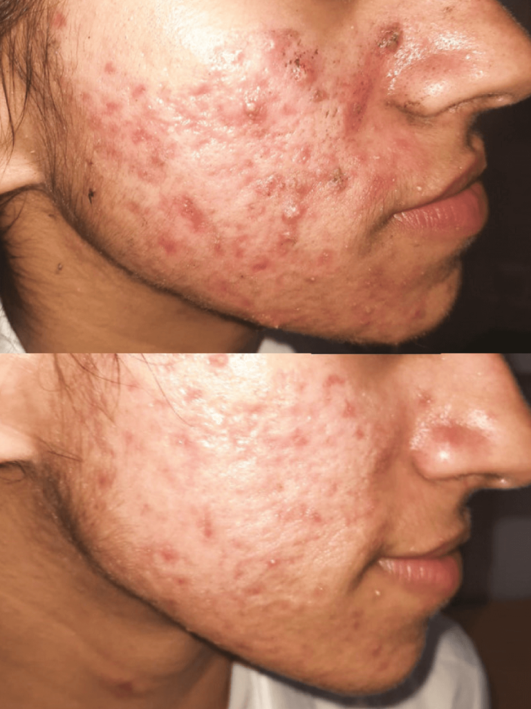 - AKNÉS BŐR ESETÉN: A megfelelően előkészített aknés bőr esetében minimum 3-4 kezelés után megakadályozza új aknék, komedók képződését és a meglévő gyulladásokat is normalizálja. (A klinikai tanulmányok szerint az első kezelés után 5-15%-os a javulás. 6 alkalom után, majd 12 hét elteltével 70%-al csökkent az aknés gyulladások száma.) A kezelést javasolt 1-2 hetente végezni.