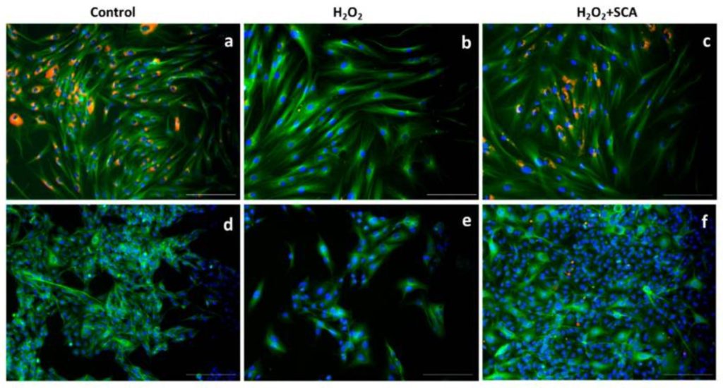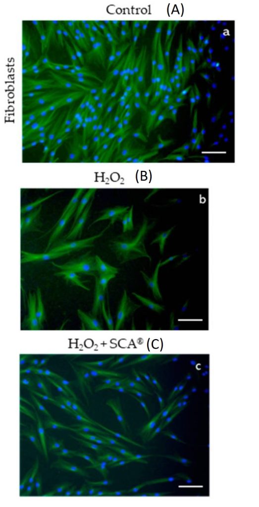 Annak bebizonyítására, hogy a csiganyálka kezelés hatással van-e az öregedéssel összefüggő morfológiai változásokra, megvizsgáltak egy citoszkeletont immunfluoreszcenciával. Az öregedő fibroblasztokra a sejtforma ellaposodása és megnagyobbodása jellemző, ami a H2O2-nek kitett sejtekben figyelhető meg (B). A csiganyálkával kezelt sejtek azonban visszanyerték a bazális citoszkeleton mikrotubulusok megnyúlását és méretét az öregedő sejtekhez képest (C).