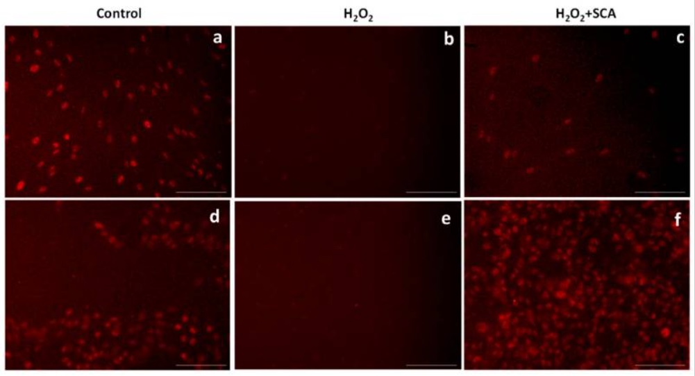 Immunfluoreszcens festéssel értékelték az öregedési indukcióra érzékeny különböző fehérjék expressziós szintjét H2O2 hatásának csiganyálka jelenlétében vagy hiányában. Az egyik legreprezentatívabb öregedési marker az mTOR, amely az autofágia iniciációjának döntő szabályozója, és a SASP szabályozáson keresztül részt vesz az öregedés folyamataiban. Így az mTOR túlzott aktiválása elősegíti a sejtek öregedését, míg elnyomása blokkolja a sejtek öregedését, csökkenti a SASP-t és meghosszabbítja a sejt élettartamát. Ezért az mTOR autofágia szabályozó központi szerepet játszik az öregedéssel összefüggő folyamatok meghatározásában. A H2O2 által kiváltott öregedés az mTOR szintek növekedését okozta (B, E), míg a csiganyálka kezelés megfordította ezt a hatást és gátolta az mTOR expressziót (C, F).