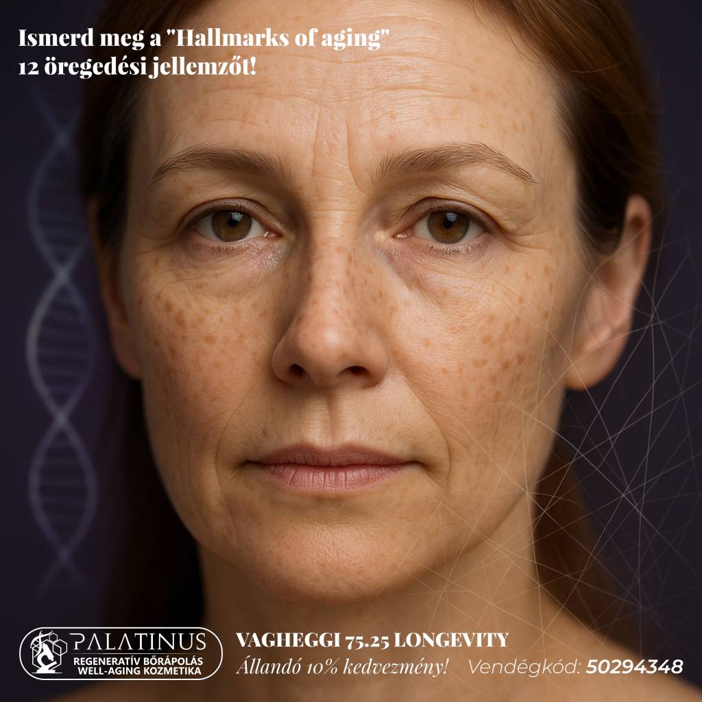 A biológiai öregedés ma már nem pusztán ráncokat és petyhüdt bőrt jelent. A tudomány a „hallmarks of aging” – vagyis az öregedés 12 jellemzője – révén egy komplex, egységes rendszert alkotott, amely segít megérteni, hogyan és miért változik a bőr az idő előrehaladtával. Ez a modell – amelyet először a Cell tudományos folyóiratban publikáltak 2013-ban (Forrás), majd 2023-ban frissítettek (Forrás) – 12 biológiai folyamatot azonosított, amelyek a test öregedését mozgatják. Ezek a folyamatok nemcsak az általános egészségi állapotot, hanem a bőr biológiai korát is befolyásolják.