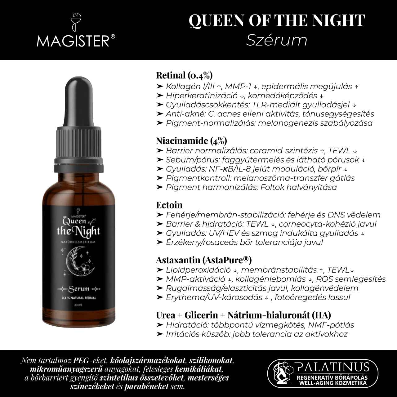 | Hatóanyagok | 0.4% Retinal, 4% Niacinamide, Ectoin, Astaxantin, Hialuronsav, Jázmin hidrolátum |